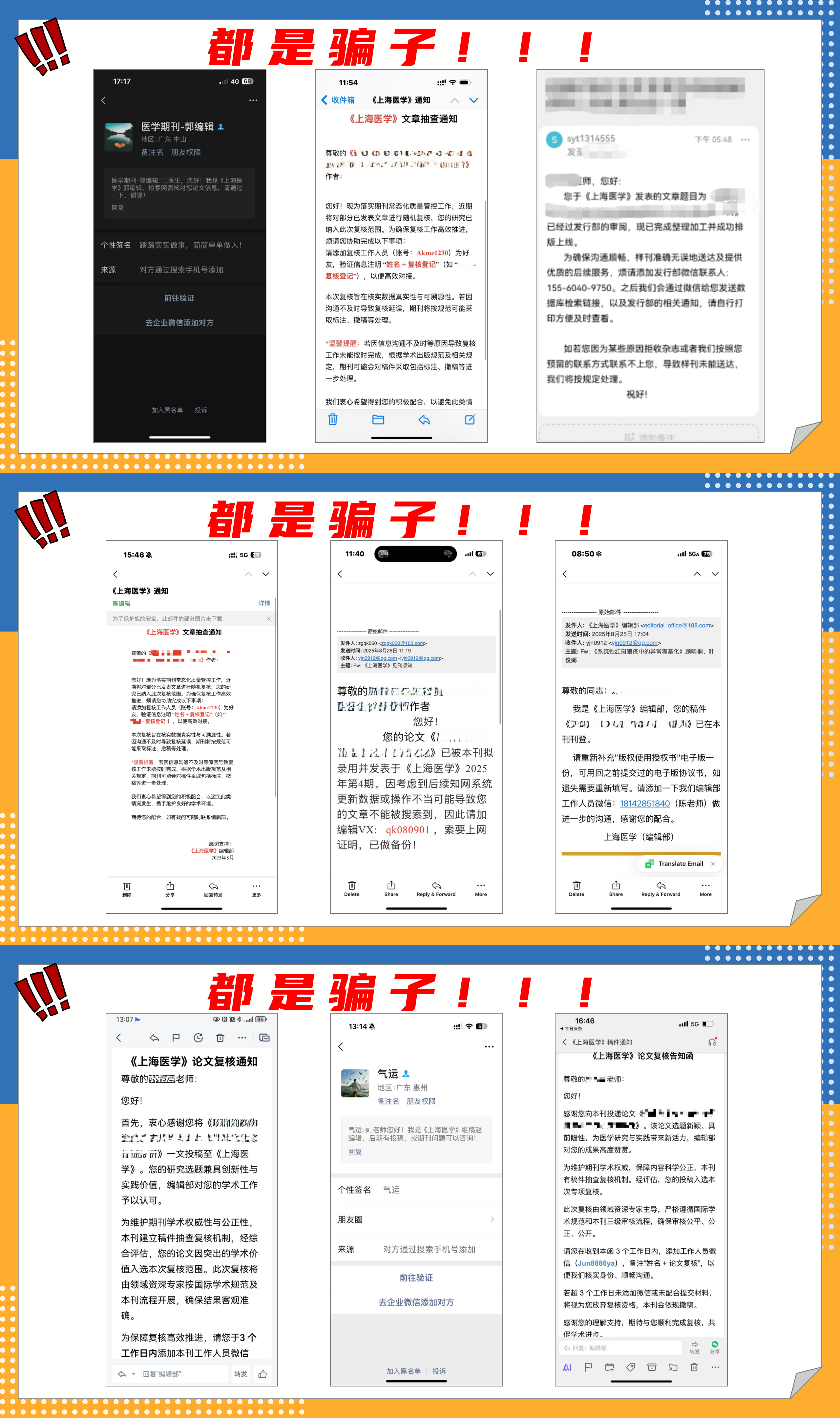 本刊近期收到大量作者反馈,其发表的论文公开上网后,接收到骗子的邮件、电话及微信好友申请。为了提高您的反诈意识和鉴别能力,现将典型的诈骗形式以图片方式予以公开,见下图(持续添加)。