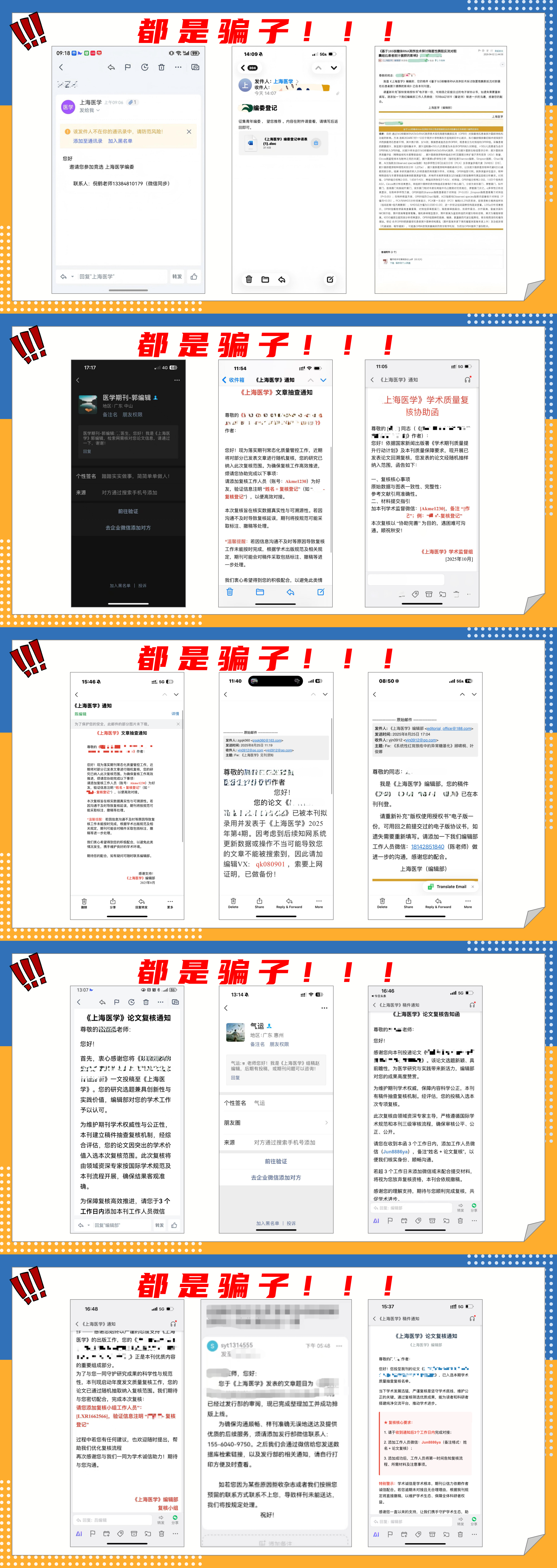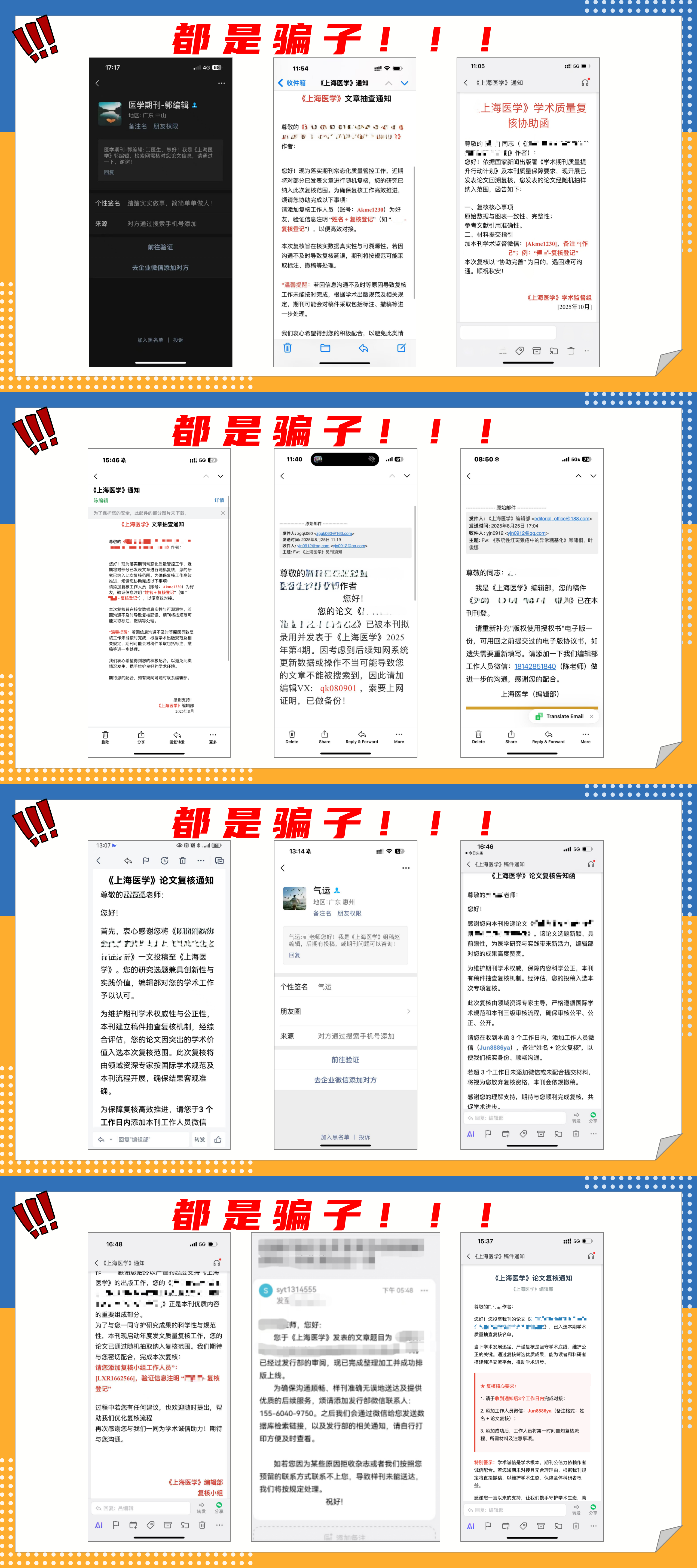 如您无法确认是否为诈骗信息,可致电官方电话021-62178606,或发送邮件至官方邮箱smasmj@shsma.org.cn,或咨询论文正式上网前与您沟通论文修改的编辑老师,同时也欢迎您将收到的诈骗信息发送给编辑部。
