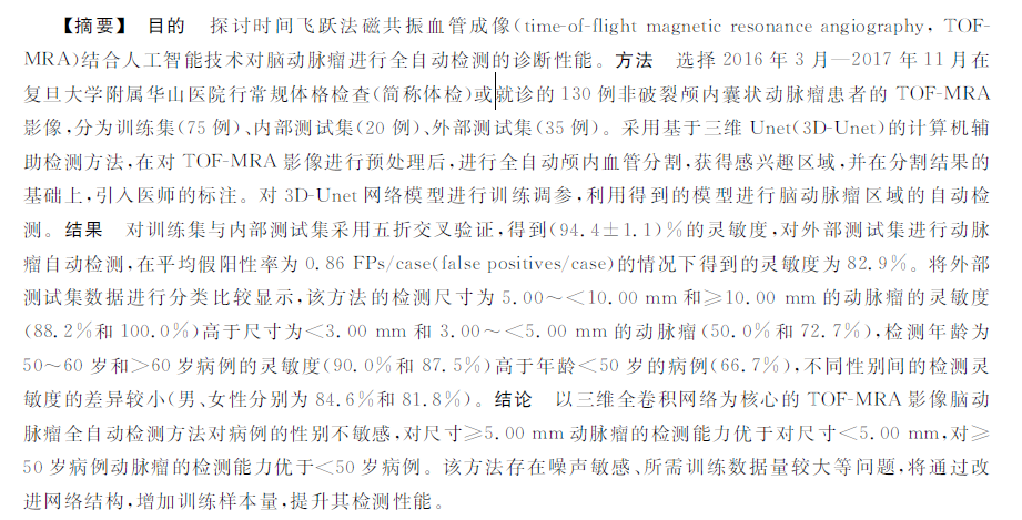【专题研究】基于深度学习的时间飞跃法磁共振血管成像对脑动脉瘤自动检测方法研究