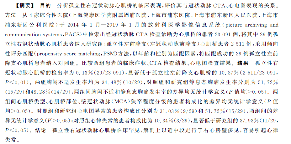 【论著】孤立性右冠状动脉心肌桥的临床表现特点