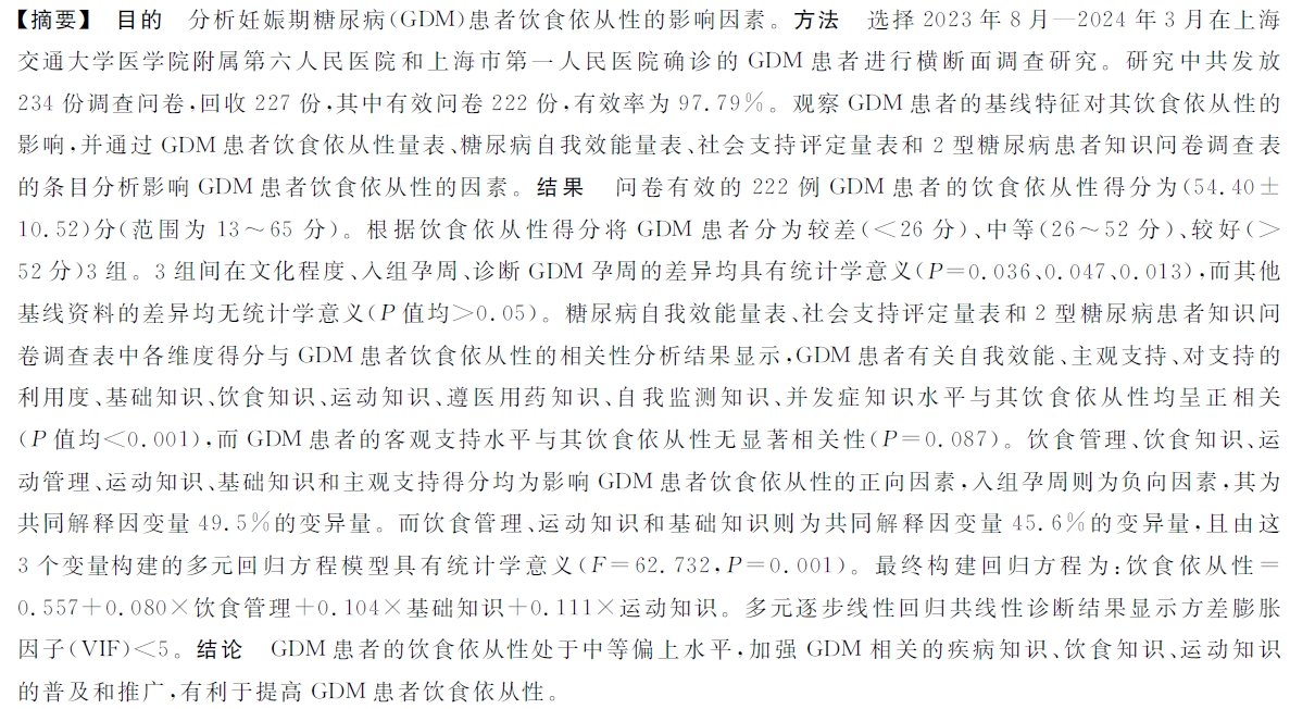 【论著】妊娠期糖尿病患者饮食依从性的影响因素分析