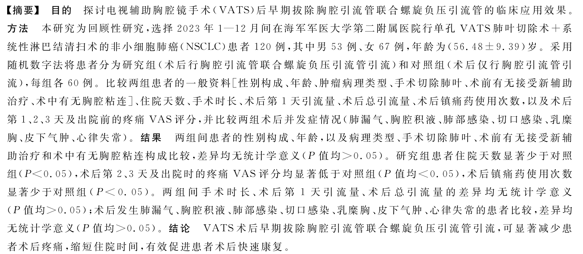 【青年学术论坛·胸外科】电视辅助胸腔镜手术后早期拔除胸腔引流管联合螺旋负压引流管的临床应用研究