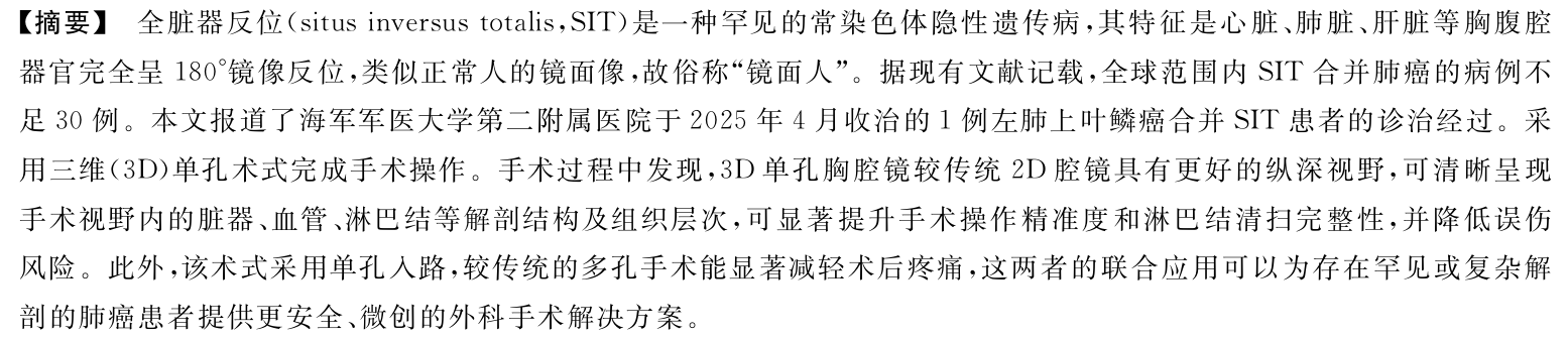 【青年学术论坛·胸外科】三维单孔胸腔镜治疗全脏器反位合并肺鳞癌一例