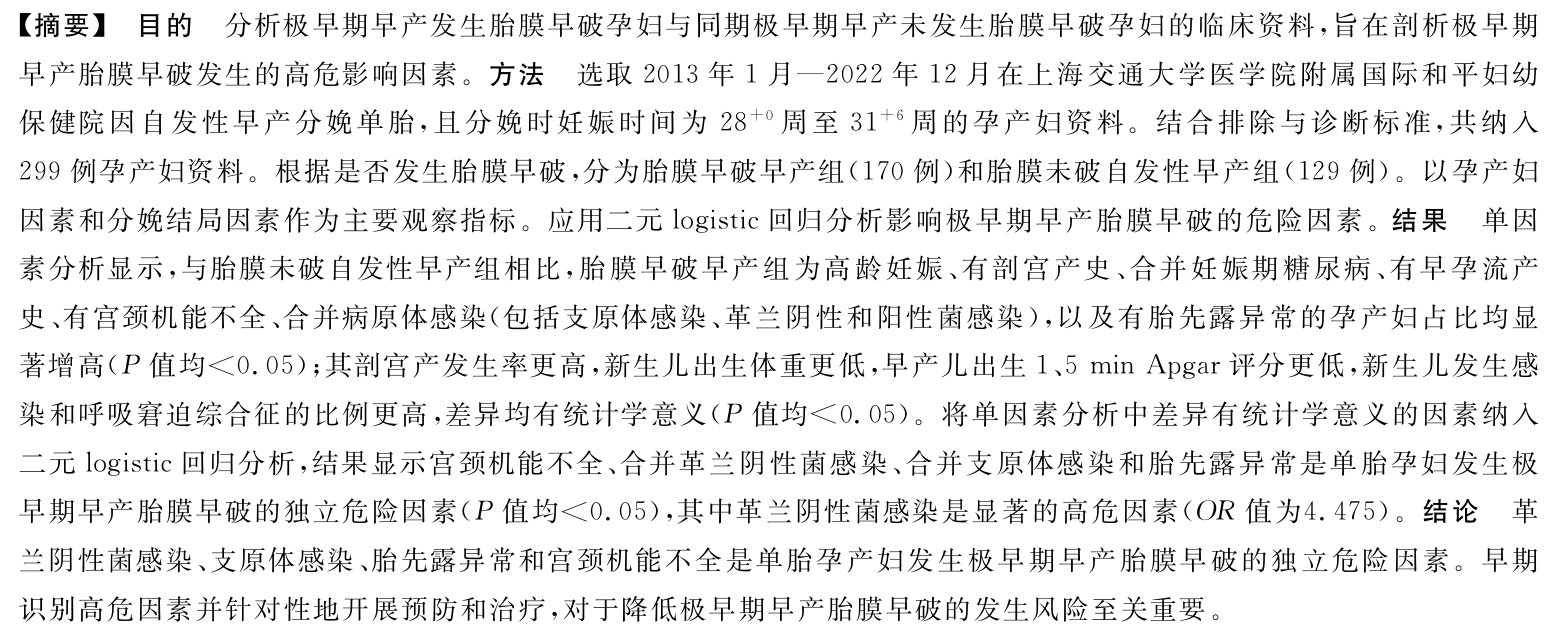 【青年学术论坛】极早期早产胎膜早破的相关危险因素分析