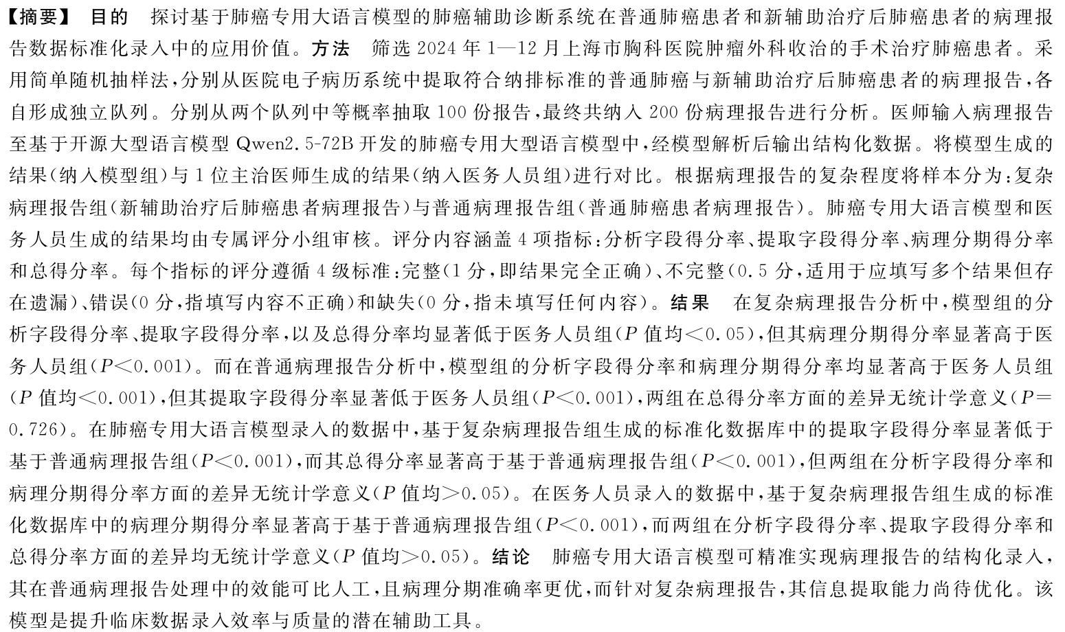【论著·胸外科】基于肺癌专用大语言模型构建标准化数据库的效能评估