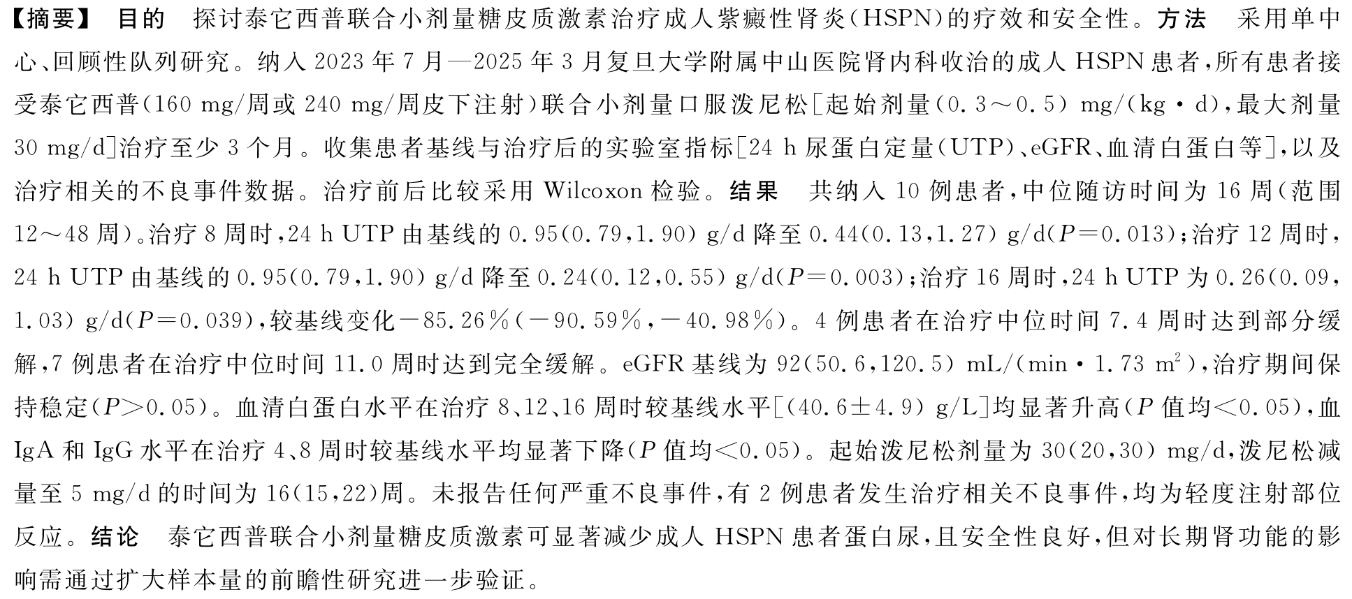 【论著·肾脏病】泰它西普联合小剂量糖皮质激素治疗成人紫癜性肾炎的疗效和安全性:一项单中心回顾性研究