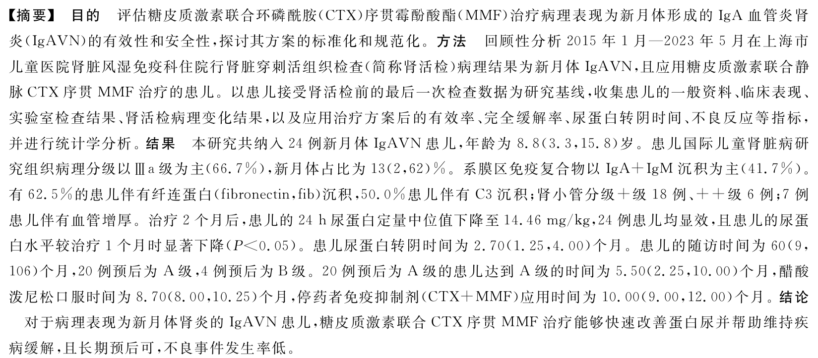 【青年学术论坛】糖皮质激素联合环磷酰胺序贯霉酚酸酯治疗儿童新月IgA血管炎肾炎的疗效观察