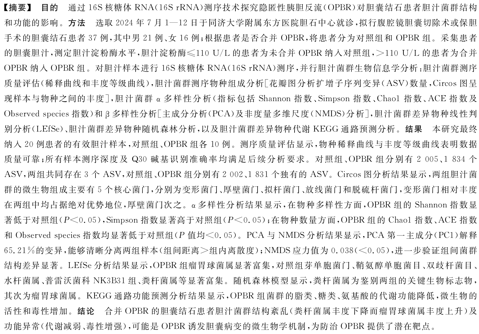 【论著】基于16S核糖体RNA测序技术探讨隐匿性胰胆反流对胆囊结石患者胆汁菌群的影响
